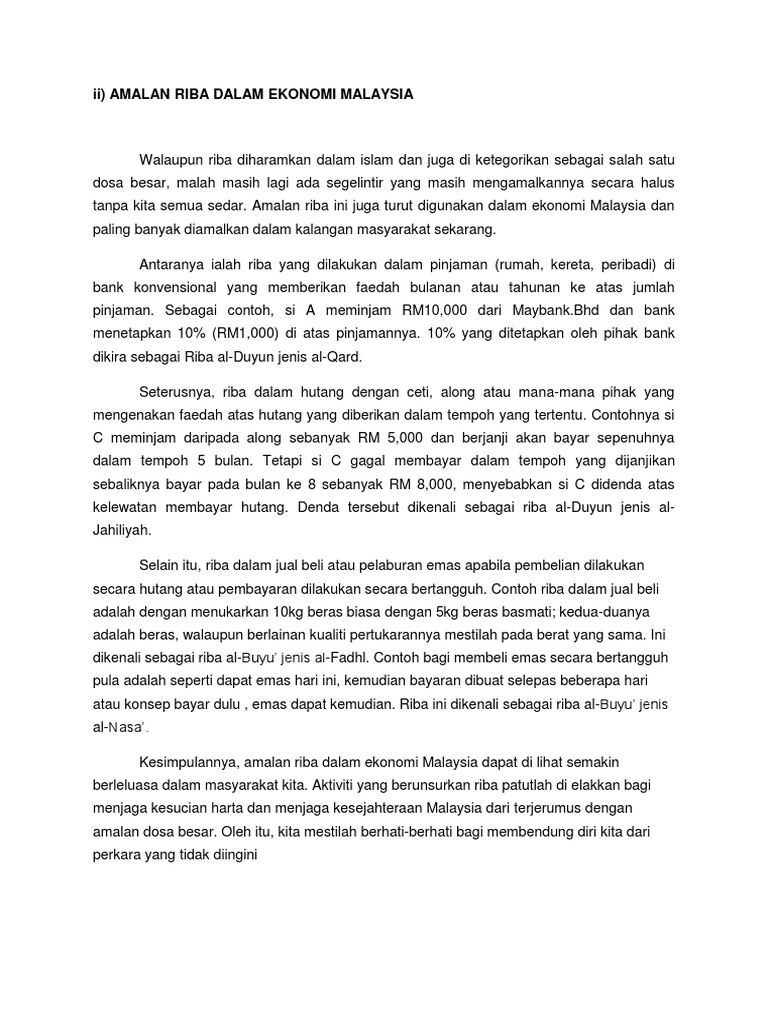 . Maka tidak boleh mencairkan cek senilai 1 juta rupiah menjadi uang tunai 990 ribu rupiah. Dalam ekonomi Islam di Malaysia ada beberapa hadist yang selalu menjadi pedoman dan landasan yang mengandung arti ukhuwah dan pelarangan riba dalam pelaksanaannya ditengah masyarakat. Contoh Riba Masakini Sistem perbankan.